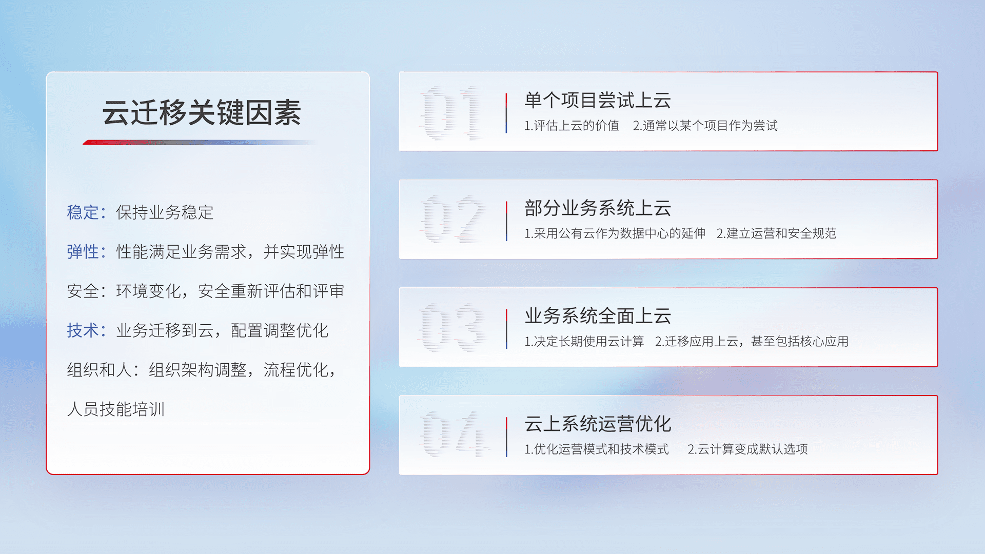 结合实际业务,,,,从规划设计、、、云平台选型、、、云原生改造、、、数据迁移、、集成交付,,迁移全过程为客户识别最佳上云路径,,,做好风险识别管理,,设计网络架构、、、身份权限、、安全审计合规、、、操作审计、、、日志审计、、、监控告警策略、、、多站点容灾设计等,,,对云上基础设施进行整体规划,,提升IT治理水平,,,以满足弹性、、高可用、、、高性能的需求。。。