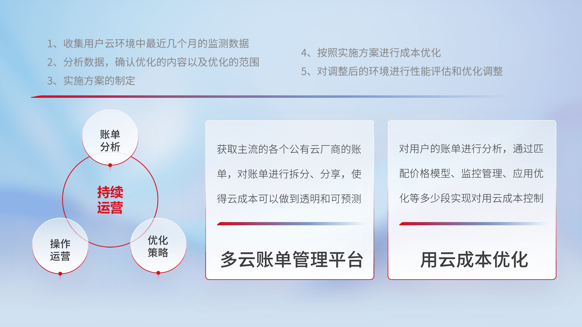 通过多云纳管,,,以统一的资源数据模型把客户的云资源进行抽象和封装,,,进而实现对多云资源的统一操作,,,保障云资源管理的可靠性、、、稳定性与可用性。。。。量身定制化运维内容,,,,配置、、、开发运维、、、、补丁管理、、、、备份、、监控、、、认证和访问管理、、、审计和日常巡检等,,,,保障在用云过程中的可靠度,,稳定度以及高可用率。。。。